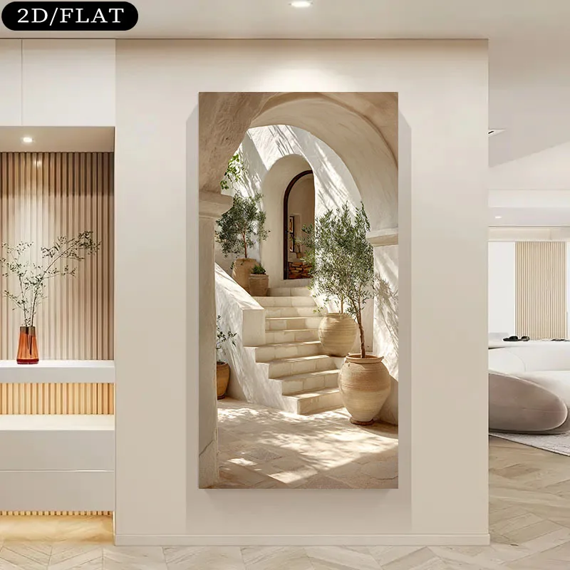 ภาพพิมพ์บนผ้าใบลายต้นมะกอกเมดิเตอร์เรเนียนขนาดใหญ่ 1 ชิ้น ภาพพิมพ์ศิลปะตกแต่งผนังลายภูมิทัศน์เกาะกรีกสีขาวเบจสไตล์โมเดิร์นสำหรับตกแต่งบ้าน