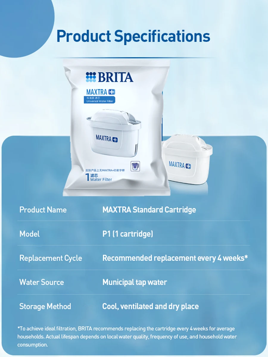 *เพื่อให้ได้การกรองในอุดมคติ BRITA แนะนำให้เปลี่ยนตลับหมึกทุกๆ 4 สัปดาห์สำหรับครัวเรือนทั่วไปอายุการใช้งานจริงขึ้นอยู่กับคุณภาพน้ำในท้องถิ่น ความถี่ในการใช้งาน และปริมาณการใช้น้ำในครัวเรือน