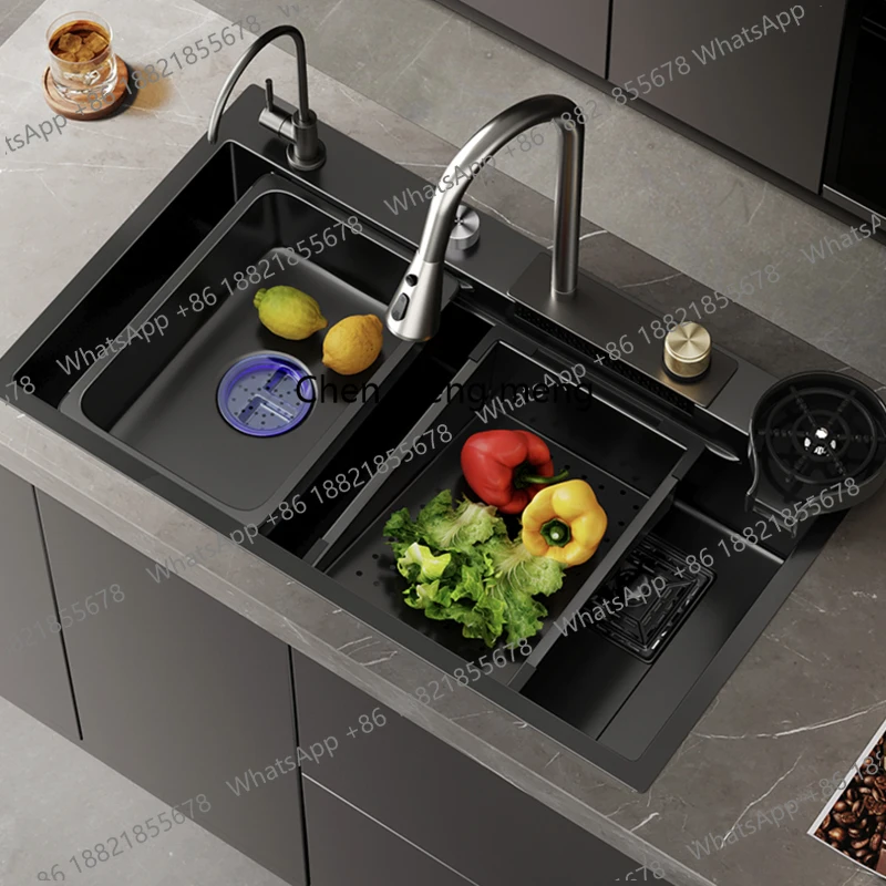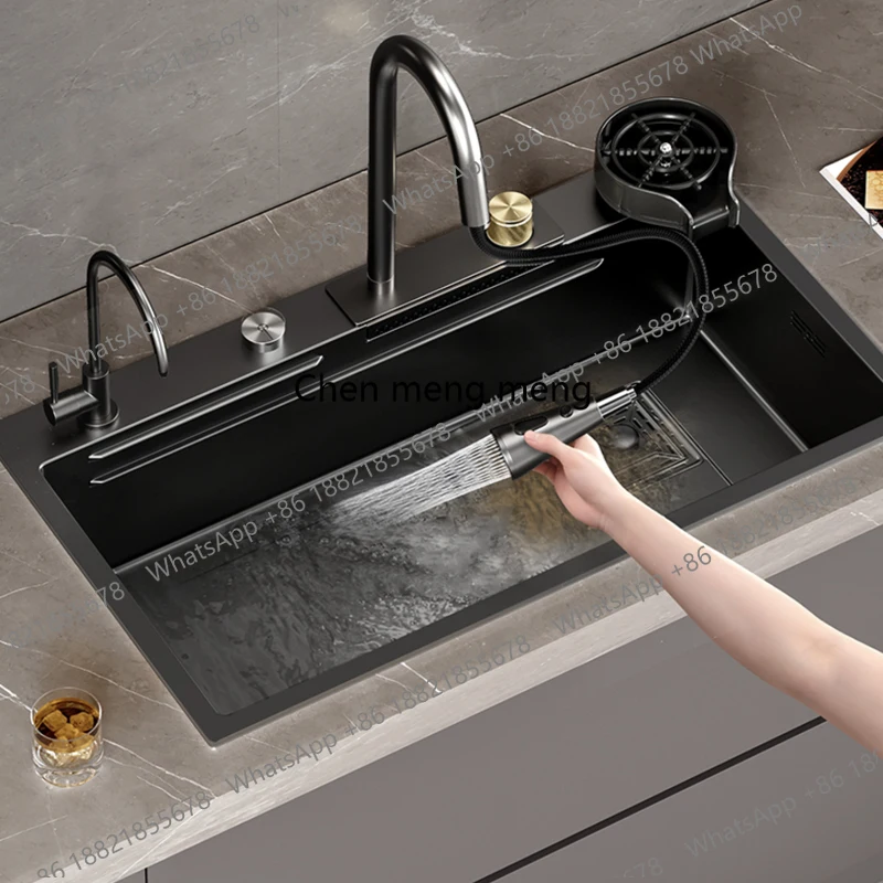 อ่างล้างจานสแตนเลสสีดำแบบเรนด์แดนซ์ ขนาดใหญ่ ชามเดี่ยว แบบติดตั้งใต้เคาน์เตอร์ พร้อมก๊อกน้ำและท่อระบายน้ำ