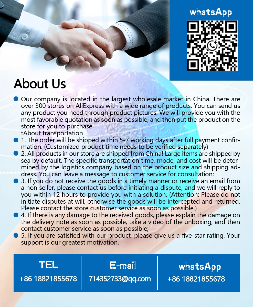 2.เนื่องจากผลิตภัณฑ์นี้เป็นพัสดุขนาดใหญ่ที่จัดส่งจากประเทศจีน โดยปกติจะใช้เวลาในการจัดส่ง 35-60 วันเวลาในการจัดส่งจะแตกต่างกันสำหรับที่อยู่จัดส่งที่แตกต่างกัน
